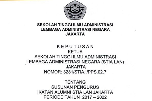 Dengan memanjatkan puji syukur ke hadirat Allah SWT, telah terbentuk oragnisasi Ikatan Alumni Sekolah Tinggi Ilmu Administrasi – Lembaga Administrasi Negara (STIA – LAN) Jakarta pada tahun 2017. Organisasi ini dibentuk sebagai wadah para alumni STIA-LAN untuk silaturahmi, memelihara dan meningkatkan kekeluargaan serta menanamkan kekompakan sesama Alumni serta memupuk dan meningkatkan rasa tanggungjawab sosial kepada masyarakat.Eksistensi kegiatan alumni STIA LAN Jakata sangat diperlukan oleh STIA LAN Jakarta untuk memenuhi akreditasi, oleh karena itu keberadaan Ikatan Alumni sangat penting untuk menunjang kegiatan STIA LAN Jakarta.Untuk itu diperlukan adanya kolaborasi kegiatan antara Ikatan Alumni STIA Lan Jakarta dengan civitas akademi STIA LAN Jakarta,