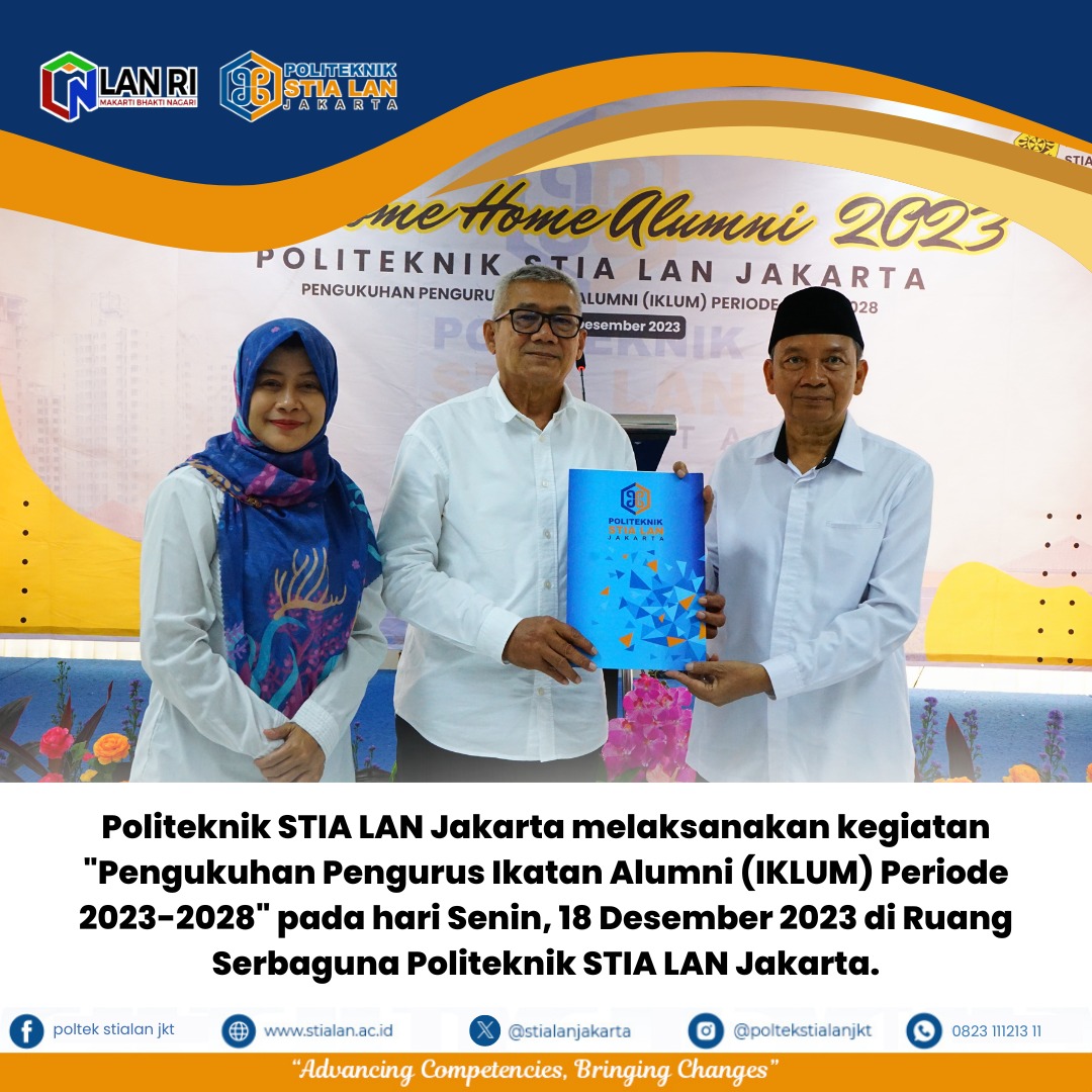 Senin, 18 Desember 2023, Politeknik STIA LAN Jakarta melaksanakan kegiatan “Pengukuhan Pengurus Ikatan Alumni (IKLUM) Periode 2023-2028” di Ruang Serbaguna Politeknik STIA LAN Jakarta